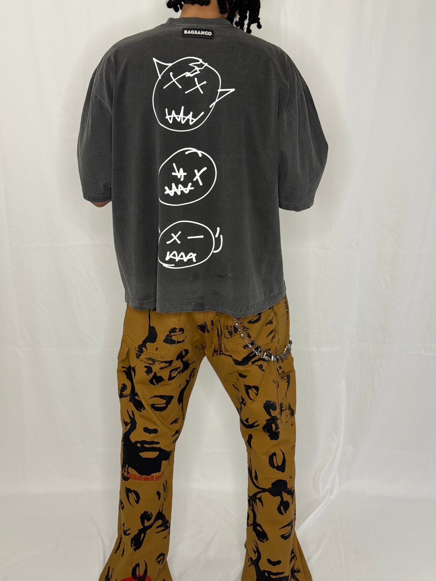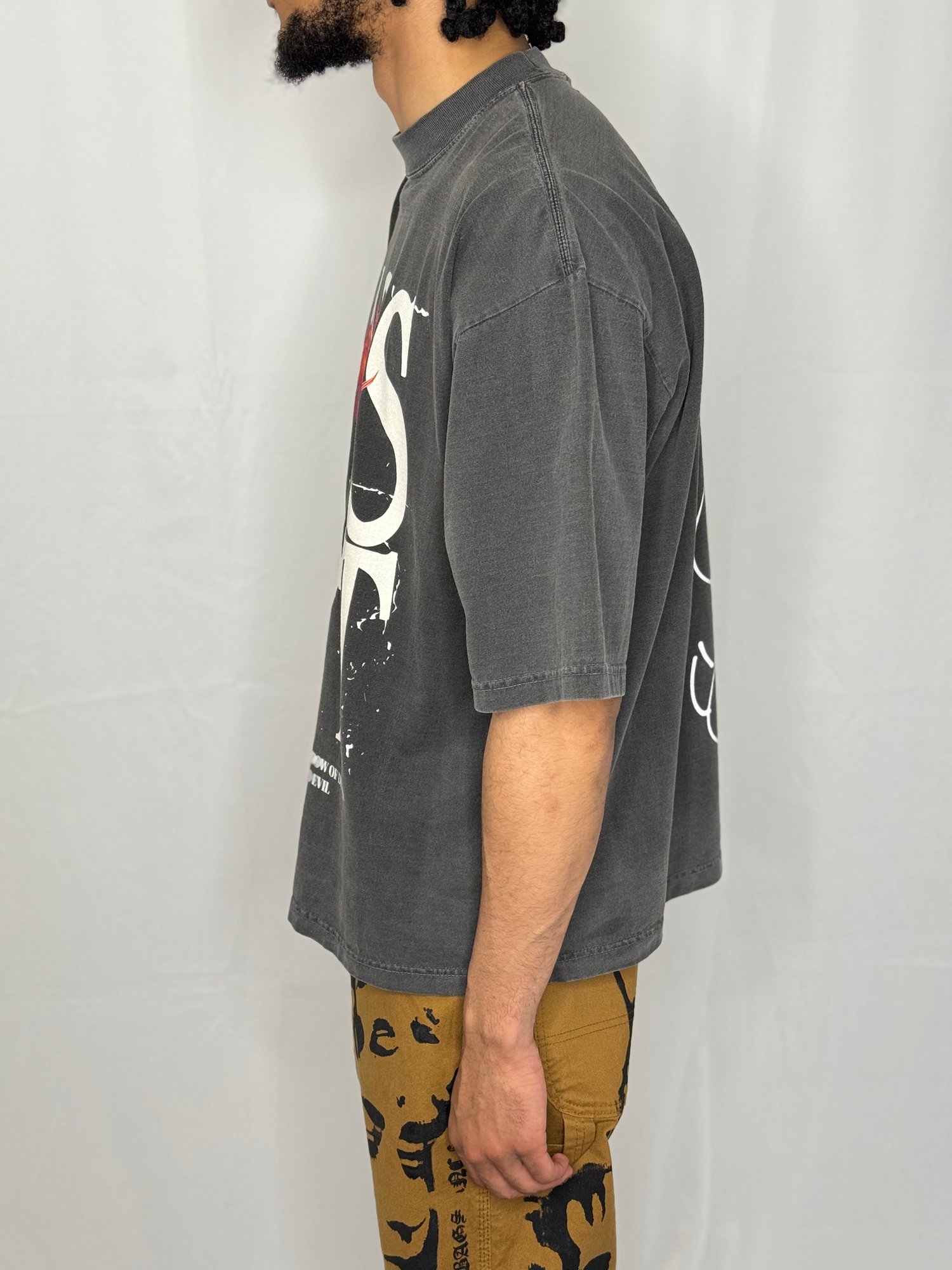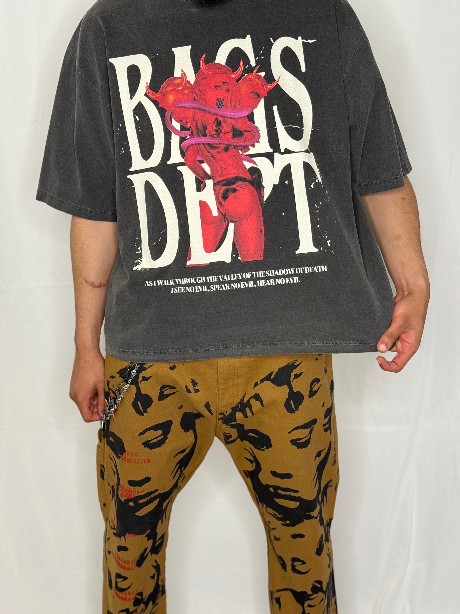 The Dead Face T-Shirt is one of a kind! This drop shoulder box cut t-shirt has an exclusive logo on the front, with customized art in red, cream, and purple. The back of the t-shirt illustrates the "I see no evil, hear no evil, and speak no evil" characters on the back.