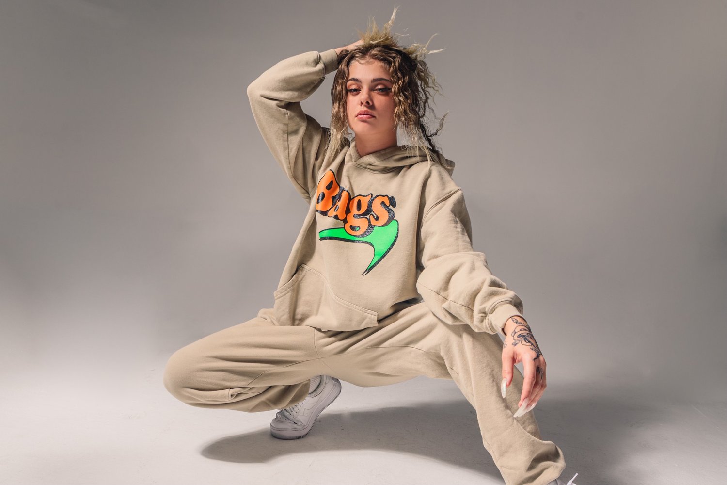 The limited edition Beehive Collection Sweatsuit is a cut and sew, custom dyed collection. The hoodie has the original BAGS log on the front in orange and green, with the beehive logo on the back. The sweatpants has the original BAGS logo on the top left leg.