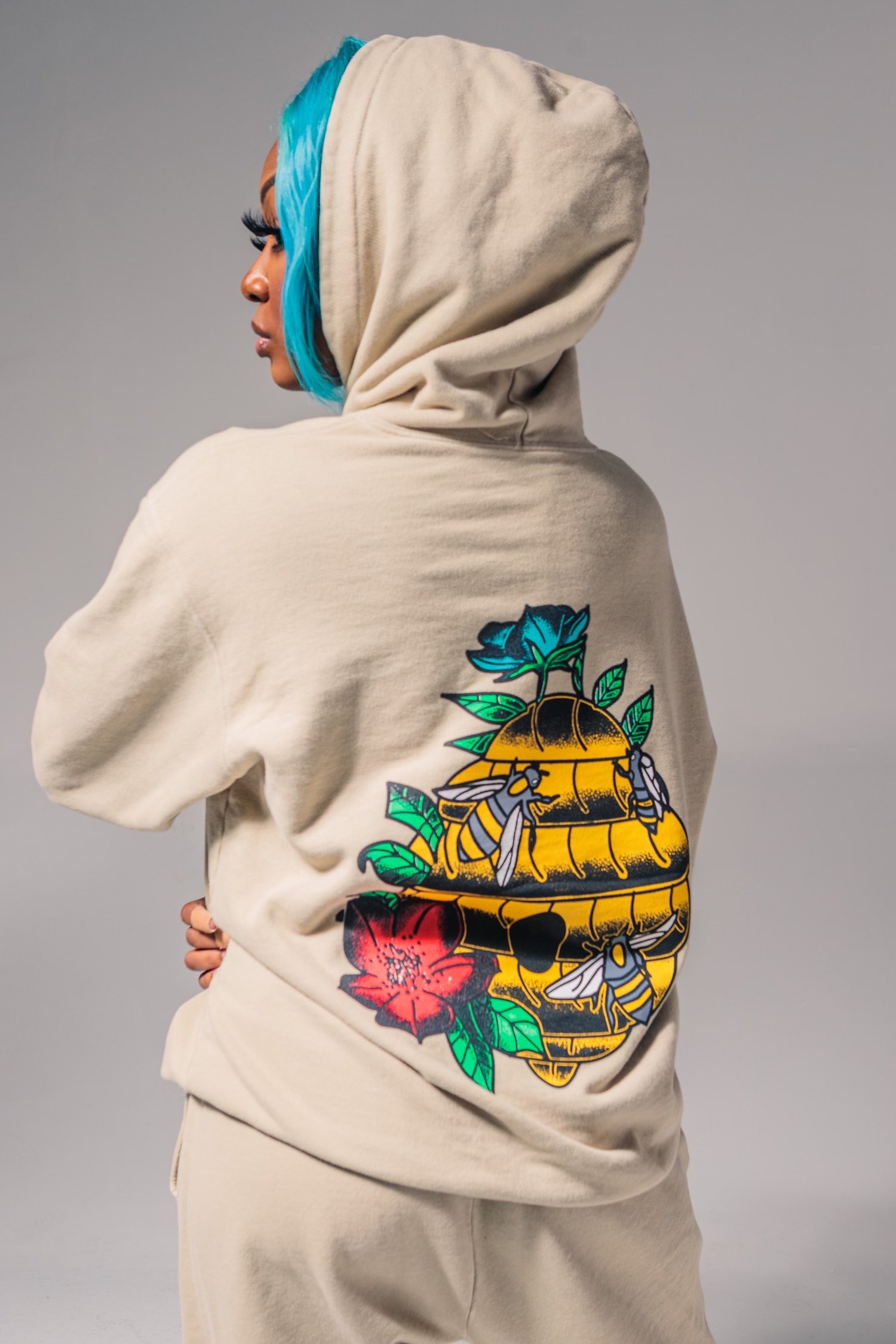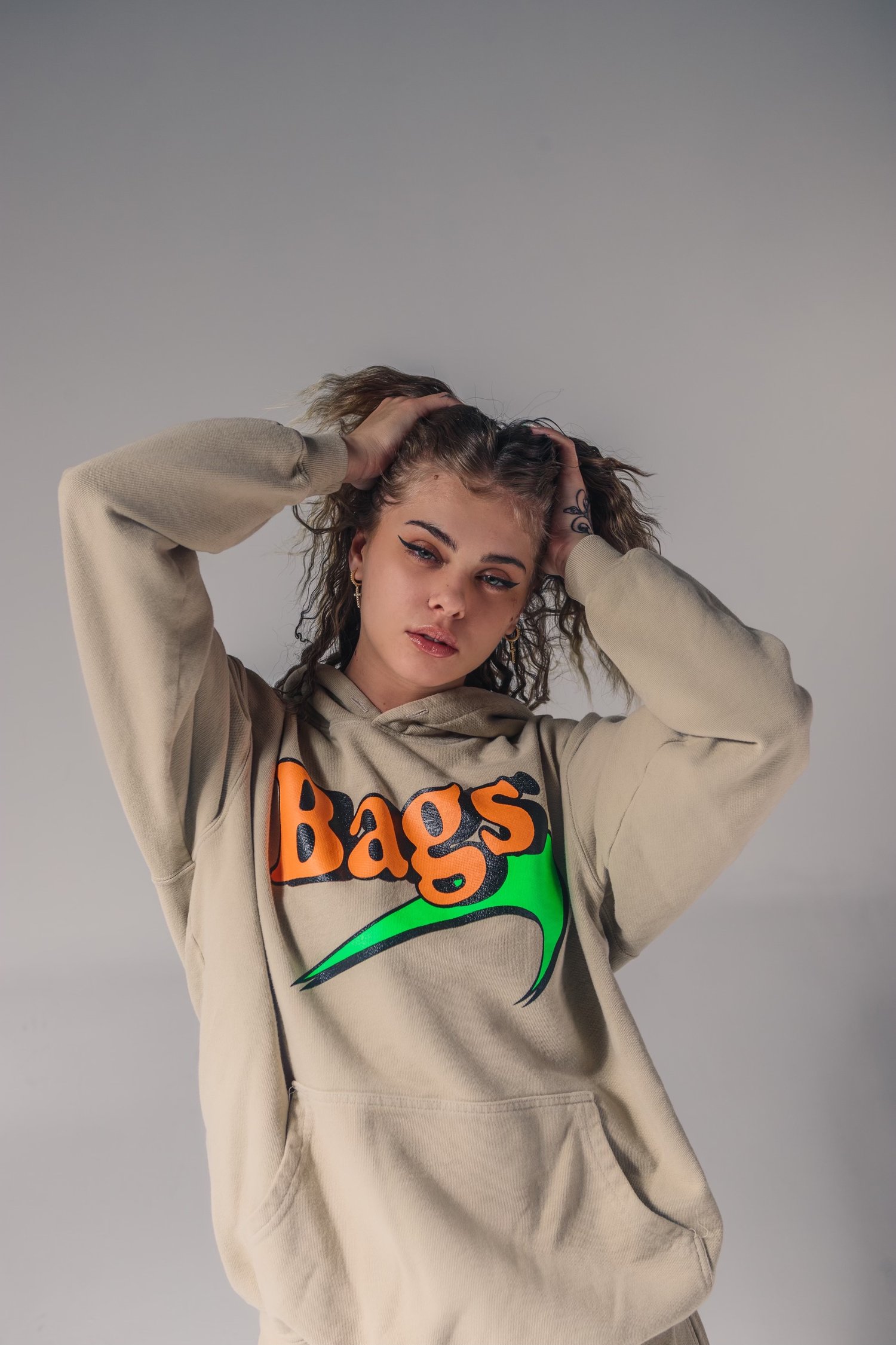The limited edition Beehive Collection is a cut and sew, custom dyed collection. Each hoodie includes the original BAGS log on the front in orange and green, with the beehive logo on the back.